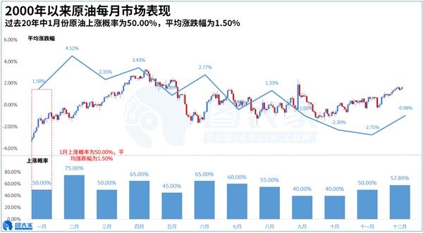 Data Talks统计了自2000年来过去20年每月WTI原油市场表现后发现,1月油价上涨概率为50.00%,平均涨跌幅度为1.50%。