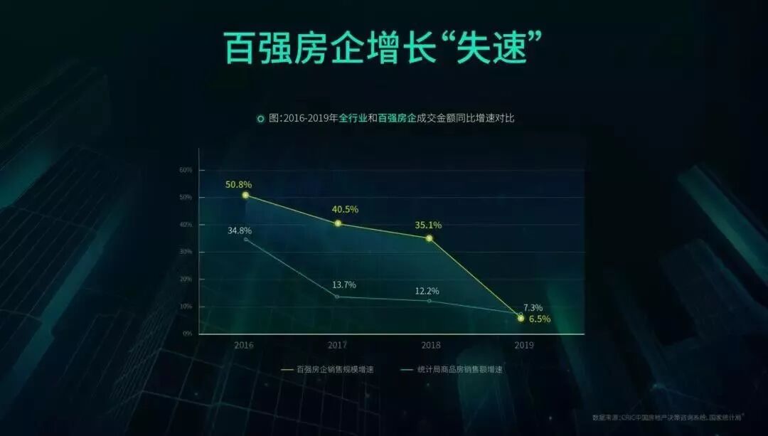 2016年,百强房企增速为50.8%,2017年降至40.5%,2019年近乎出现断崖式下跌,只有6.5%。