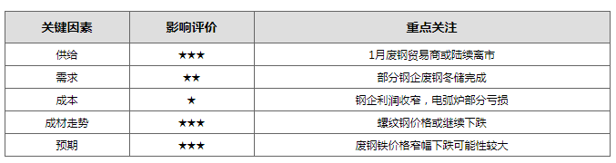 综上所述,卓创预计1月国内废钢铁价格或窄幅下跌,预计下跌空间在20-40元/吨。临近春节假期,市场成交将越发冷清,电弧炉钢企将陆续停收,市场逐步进入有价无市状态。