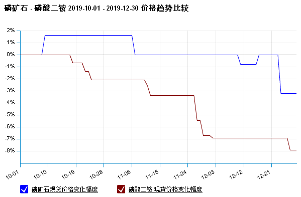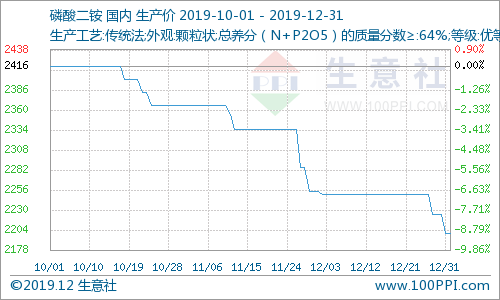 据生意社大宗榜数据显示,12月23日磷酸二铵出厂均价是2250元/吨,12月31日磷酸二铵出厂均价是2200元/吨,价格下跌了2.22% 。12月31日磷酸二铵商品指数为65.62,较昨日持平,创下周期内的历史新低,较2011年10月08日最高点102.98点下降了36.28%。(注:周期指2011-09-01至今)