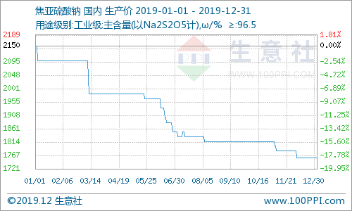 据生意社监测,2019年国内焦亚硫酸钠市场价格整体呈现单边下行态势,1月1日工业级焦亚硫酸钠均价2150.00元/吨,12月27日均价1760元/吨,年内大幅下跌18.14%。