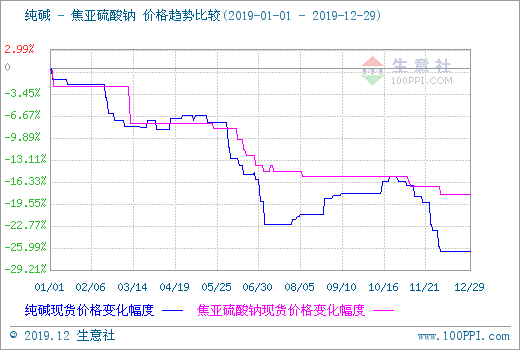 截至2019年12月27日,焦亚硫酸钠上游纯碱价格年内大幅下跌26.53%,纯碱价格大幅下跌62.99%,上游加工原料价格持续大幅下行,原料成本压制下,国内焦亚硫酸钠市场价格持续承压下行。
