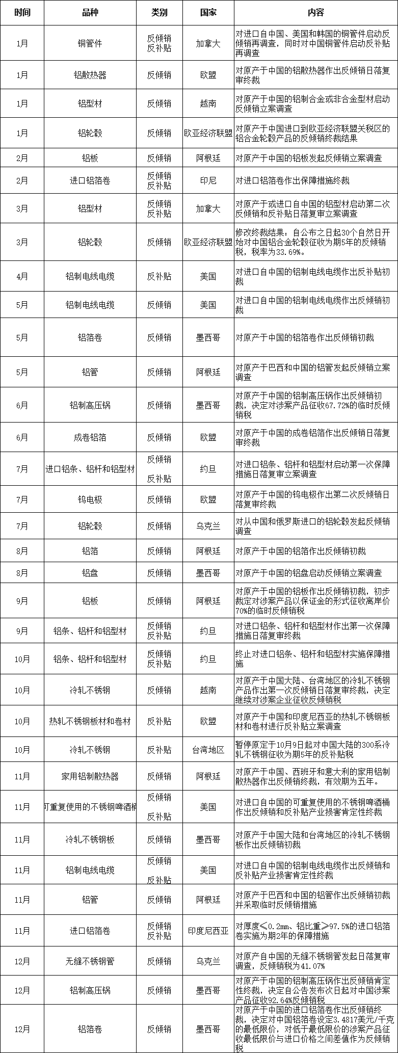 以下是2019年有色金属铝行业所发生的贸易反倾销情况。如有遗漏,欢迎评论补充。