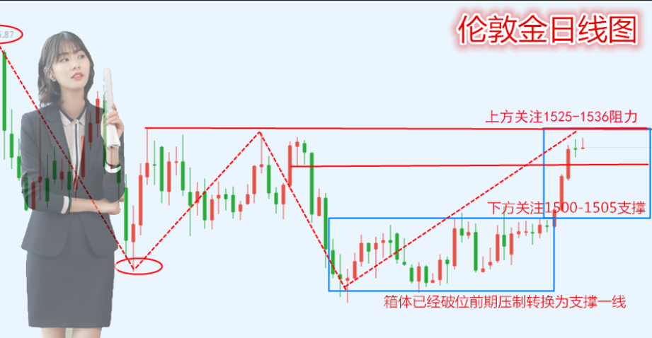 日线来看,昨日以大阳结束已是板上钉钉,早间黄金强势冲高后开始走震荡,欧盘未能走出明显弱势,可见多头的强势。美盘虽稍有回落,但幅度不大,因而后市操作上沐兮建议以回调做多为主,空单尽量选择高位再进行,以免深套无法出局!日线布林线开口向上,MACD和KDJ金叉,均线多头排列,短线来看,金价有进一步震荡上涨的趋势。从结构来看黄金自破位震荡区间后,已单边上涨达46美金,从低位1479到现在的高点1525一线只用了七天的时间,期间虽有小回调,但幅度较小,不足为虑!而如此强势的多头走势在经过横盘整理后,必然会再度开启涨幅。后续操作的话上方关注前高1525-1528的短线阻力,进一步阻力看1536,下方支撑关注1514-1511。