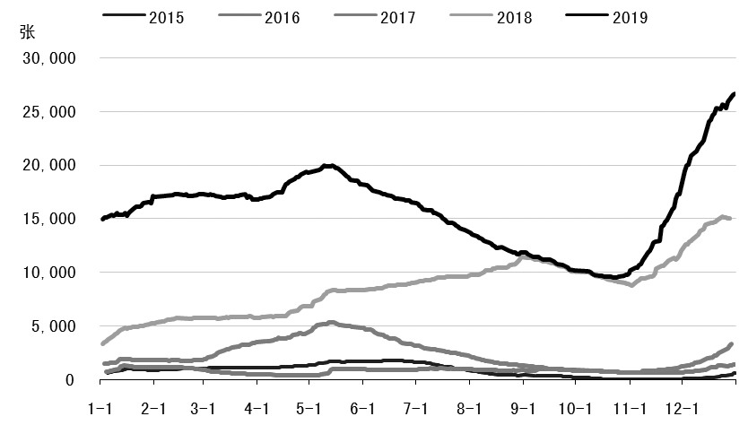 近两年来,棉花仓单屡创新高,自2019年11月开始,仓单增速明显加快,截至2019年12月31日,郑商所注册仓单数量为26591张,有效预报6503张,仓单总量达33094张,折合郑棉现货约132万吨,为郑棉仓单有数据以来的最高值,且处于继续增长过程中。业内有人士推测,仓单总量最高可能会至3.5万张的历史天量水平,届时盘面现货将高达140万吨,约占2019/2020年度新棉产量的24%。因此仓单对盘面的压力不容忽视。