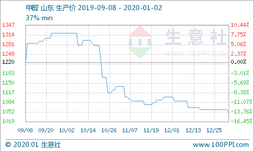 据生意社大宗商品榜数据显示,2日山东甲醛行情下跌,2019年12月31日甲醛的均价为1060.00元/吨,2020年1月2日甲醛的均价为1046.67元/吨,跌幅1.26%,当前价格同比去年下跌了9.38%。