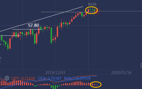 3,原油日线在62.00开始见顶,配合附图指标进入0轴,价格上涨乏力,多头动能衰减,量价同步共振,有一定的中线空头开启的迹象,因此进场空单后,可以考虑中线持有,中线开启信号点为60.60位置破位。