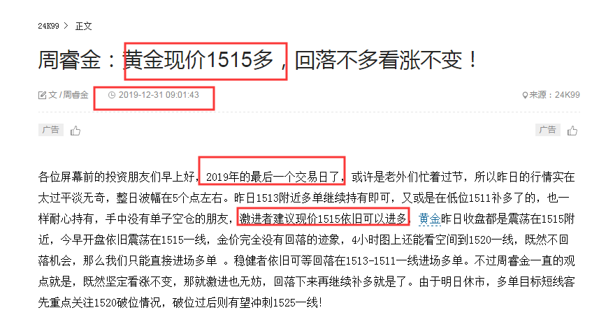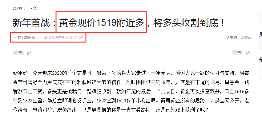 想必大家还记得周二,也就是2019年12.31号,那是2019年最后的一个交易日,黄金也是多空双杀,黄金1515多单到1523止盈,随后立即调仓反手空,1523空到1520多单小利出局。而周睿金所有的思路,均是全网公开,点位清晰,思路明确,现价给出,只是屏幕前的你是一直在看热闹,还是已经跟上获利了呢?周睿金苦口婆心的一句又一句,慧根者会跟!利润是交易的唯一注解,其余全部是扯淡!观点明确,思路清晰是我应该做的,执行结果与否则全在于你!苦练七十二变,才能笑对八十一难!过了一山又一山,没有过不去的火焰山!只要跟随周睿金的,本周就胜利了,就数钱了!事实胜于雄辩,数据揭露谎言!周睿金尽心竭力的付出!每一次的全网公开,每一次的实时布局!为的就是让你的钱包鼓起来,账户曲线飘起来!