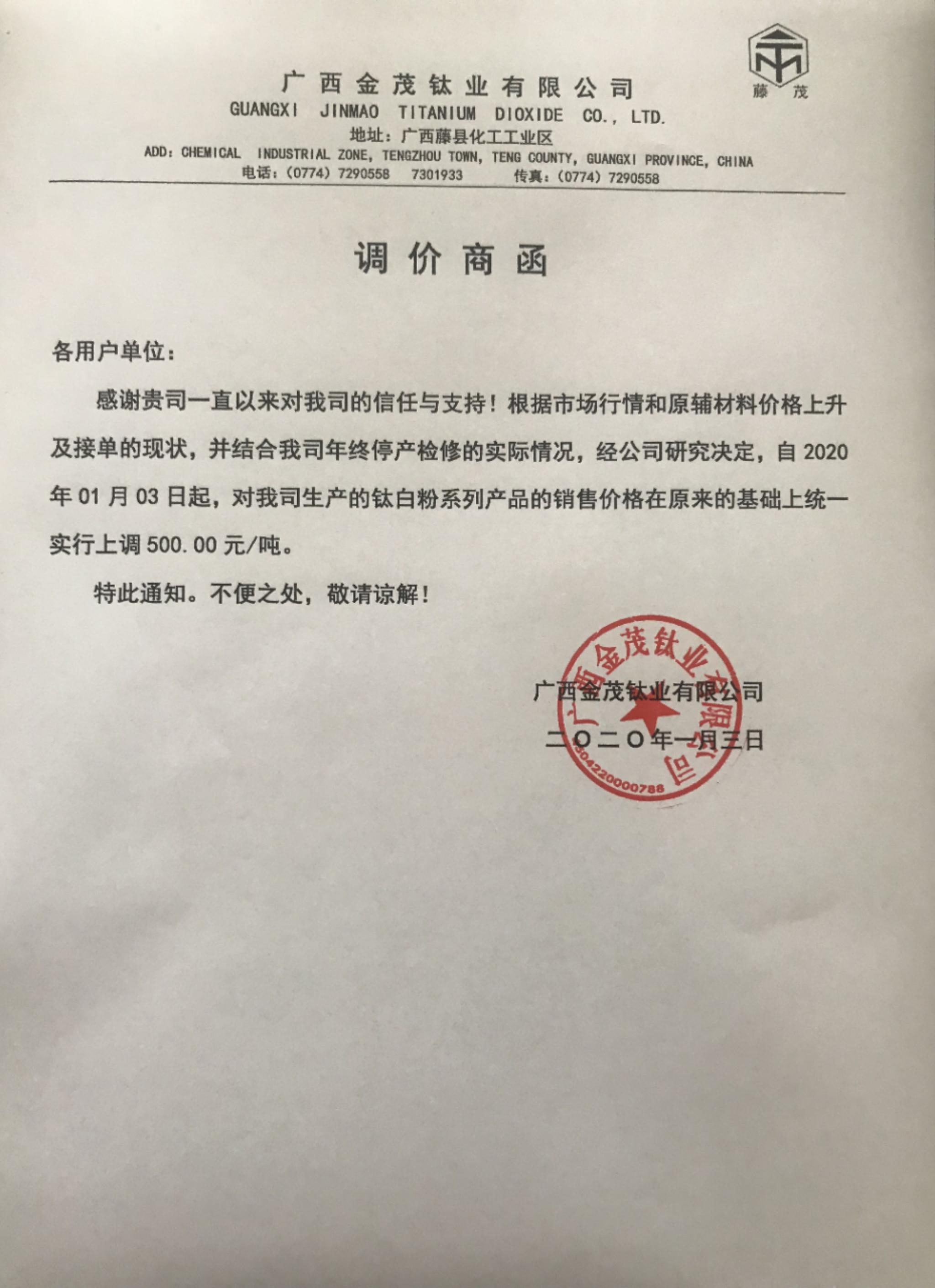 自2020年1月3日起,对我司生产的钛白粉系列产品的销售价格在原来基础上统一实行上调500元/吨。
