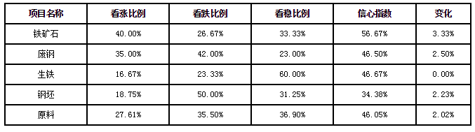 分品种来看,铁矿石信心指数为56.67,较上周增加3.33;废钢信心指数为46.50,较上周增加2.50;生铁信心指数为46.67,较上周持平;钢坯信心指数为34.38,较上周增加2.23。