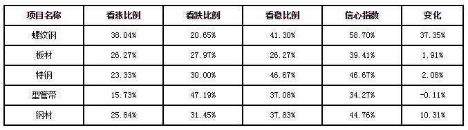 分品种来看,螺纹钢信心指数为58.70,较上周指数增加37.35;板材信心指数为39.41,较上周指数增加1.91;特钢信心指数为46.67,较上周指数增加2.08;型管带信心指数为34.27,较上周下降0.11。
