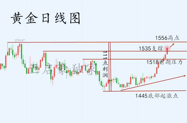 1:回落1540-1542做多,止损1537,目标1557-1565