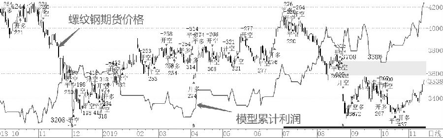 资金曲线马上就不平滑了,我们利用这个图来说明交易过程中的资金损耗。2019年春节后,模型以看空螺纹钢为主,但也发生了几次反复,这实际上说明了价格往上和往下的驱动都不足,市场情绪对价格的影响更大,模型在交易过程中出现了大量损耗,利润回吐。在2019年6月下旬短暂做多略有盈利后,又在7月试空几次终获成功,资金曲线再创新高。因此,量化交易模型并非通过神奇而又恰到好处地捕捉到最佳交易时点而获利,而是通过长时间的坚持和重复试错,才能发挥其判断上的优势,取得正收益。总之,确定性的交易机会,主观交易做不到,量化交易更做不到。