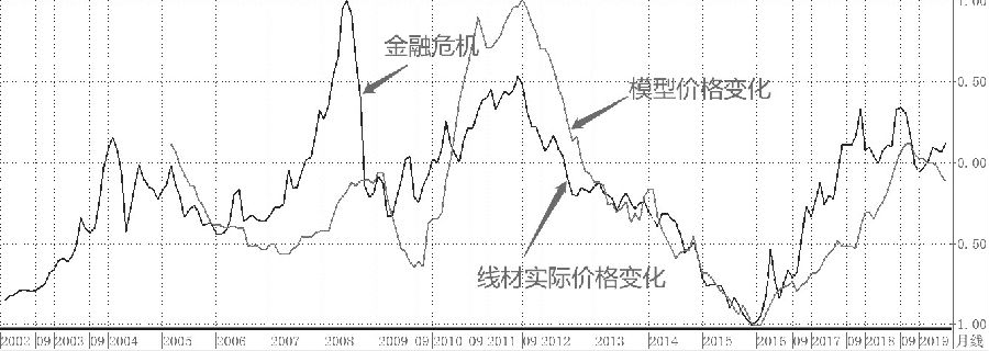 这张图的数据长达17年,其中用线材现货价格代替了螺纹钢现货价格,因为线材现货价格数据的历史更长,并且和螺纹钢价格的变化几乎完全一致。可以看到,除了受2008年金融危机及之后4万亿元投资托底经济政策的影响,螺纹钢实际价格变化领先于模型价格(因为模型没有表达金融危机对价格的影响)外,其他时间段模型的价格变化与实际价格变化的步调一致。