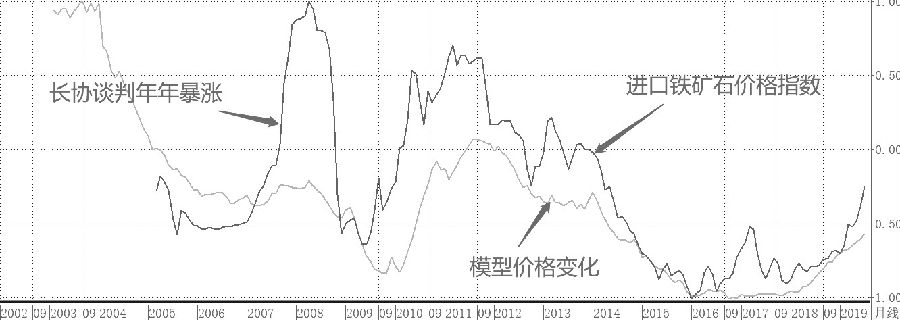 基本上,模型价格变化和进口铁矿石实际价格变化步调一致,区别在于波动幅度不同。铁矿石比螺纹钢复杂得多,而且其供给基本上被寡头垄断,模型在计算时对数据进行了筛选,才有了图中这个效果。