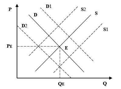 上述是一个商品定价的静态模型,?α、β、δ、γ都被设定为常数不变,用静态分析方法,可以得到商品的均衡价格。实际上α、β、δ、γ这几个参数是可变的,可以称之为可变的常数,是外生变量。当商品的供给和需求(注意不是供给量和需求量,这是内生变量)发生变化时,至少会改变α和δ的值,即改变供给曲线和需求曲线的截距,使供给曲线和需求曲线发生平移。