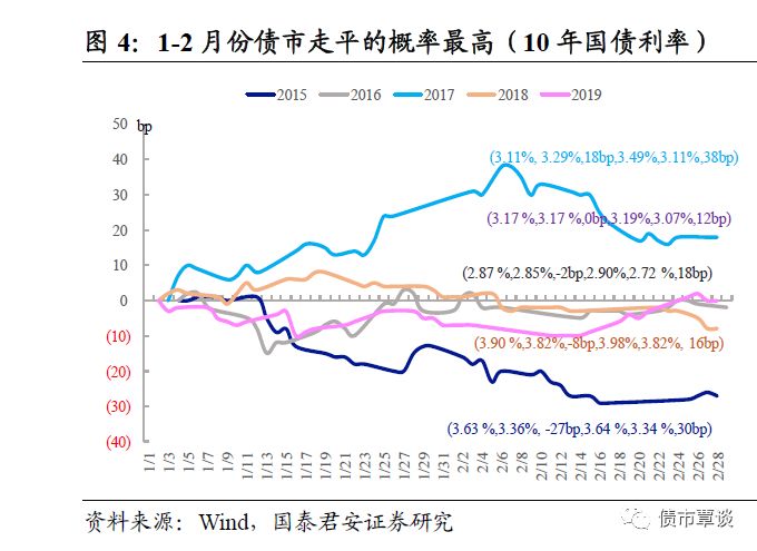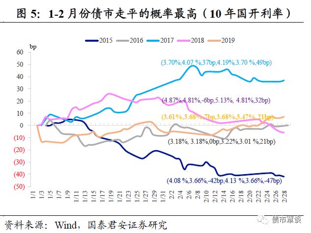在资金面平稳,以及银行保险的配置力量下,年初债市下跌的概率不高。以10年国债率累计变动来看(相较于1月第一个交易日),过去五年中,仅2017年利率上行18bp,2015年下行27bp,其余三年波动区间为[-8,0]bp。