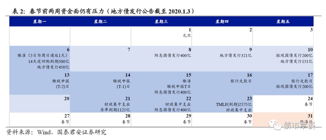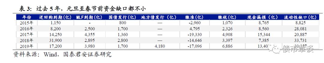 然而从过去五年来看,历年元旦至春节前资金缺口都不小,2015-2019年分别为0.9、2.8、2.1、3.4、3.0万亿,根据测算结果,2020年初资金面对冲压力并不算大。