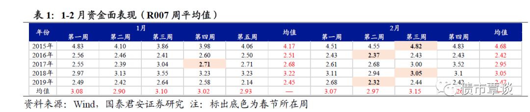 由于2015年1月开始,央行多次下调7天逆回购政策利率,从3.85%至2.5%,因此2015年初R007利率整体偏高。若剔除2015年影响,则春节前一周R007波动区间为[2.43,3.04]%。
