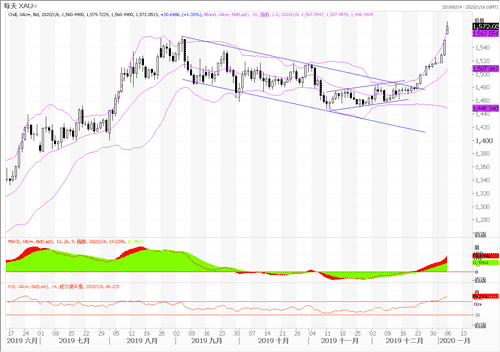 上周五美军炸死伊朗军队高层苏莱曼尼引发了避险情绪大爆发,黄金今早直接跳涨,创下了7年新高,到达1570美元一线。