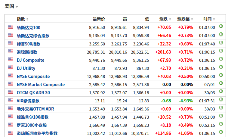 在特朗普讲话后,美股三大股指全线拉升,截至发稿,道琼斯指数指报28785.31点,涨幅0.71%;纳斯达克指数报9135.04点,涨幅为0.73%;标普500指数报3259.50点,涨幅为0.69%。富时中国A50指数期货短线拉升,涨幅扩大至1%。