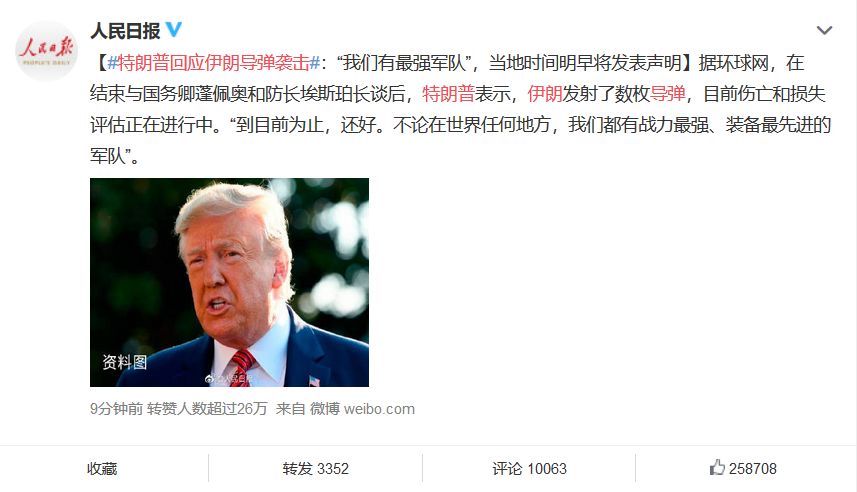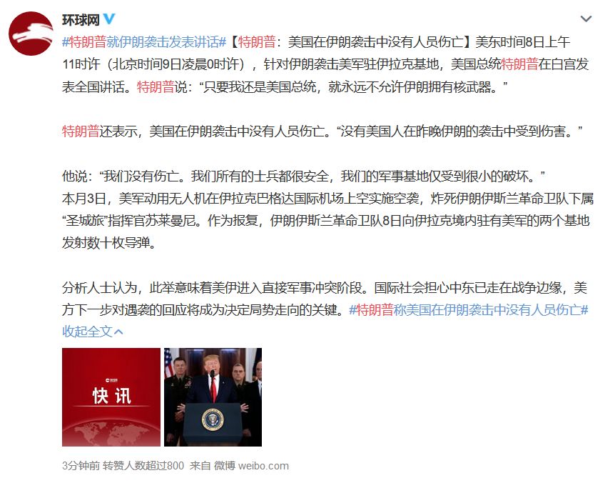 “伊朗对在伊拉克的两处军事基地发射了导弹,有关伤亡和损失的评估正在进行。目前一切尚好!”特朗普在推文中表示,“我们有着全世界威力最强大、装备最精良的军队,远远超过任何人!”
