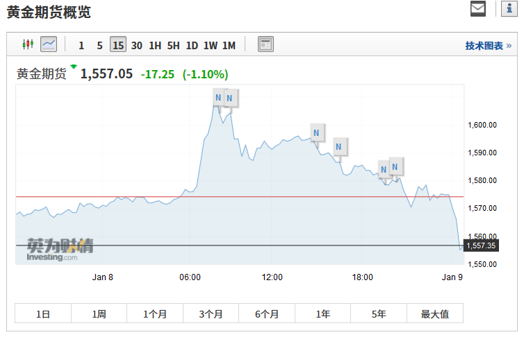 美国COMEX黄金期货在突破1600美元/盎司后持续回落,截止发稿跌1.1%,报1557.05美元/盎司。