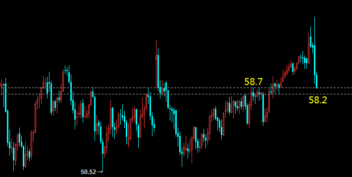 短线:58.2一线进多,止损57.7,目标60.0;(备选)