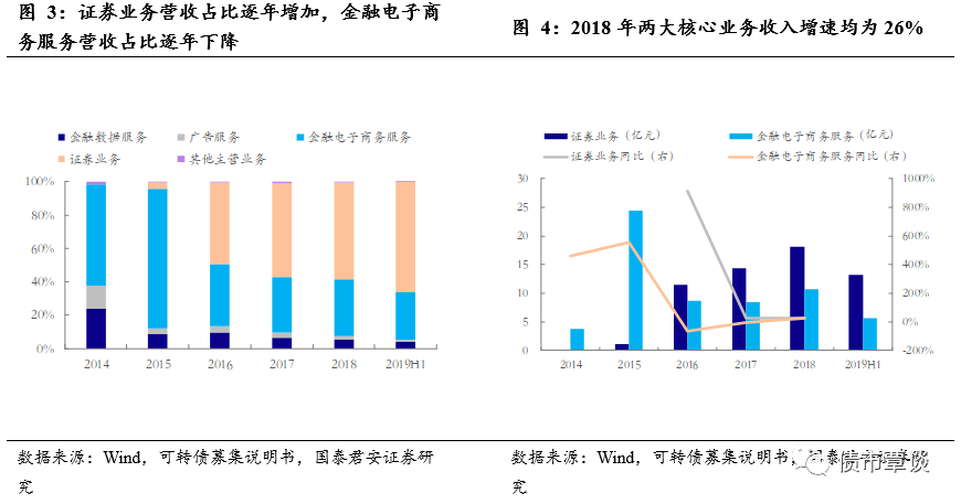 主营证券业务和信息技术服务业务,业务结构逐步转型。公司的业务可分为两大板块,证券业务和信息技术服务业务,其中信息技术服务业务又包金融数据服务、广告服务、金融电子商务服务和其他。在2015年以前,公司的证券业务营收极小,营收来源主要为信息技术服务板块,其中又以金融电子商务服务为主,该年营收为24.42亿元。2016年起,公司业务结构发生大幅变动,证券业务的收入大幅上涨至11.49亿元,同比增长915%,对营收的贡献增长至48.8%。随后,2017-2019年上半年,证券业务营收占比不断上升,分别为56.32%,58.05%和66.04%,证券业务成为公司营收的主要来源。2018年末,公司金融电子商务服务营收为10.65亿元,证券业务营收为18.13亿元,两大核心业务的营收增速逐渐趋于稳定,均为26%。2019年上半年,公司金融电子商务服务营收为5.65亿元,证券业务营收为13.19亿元。