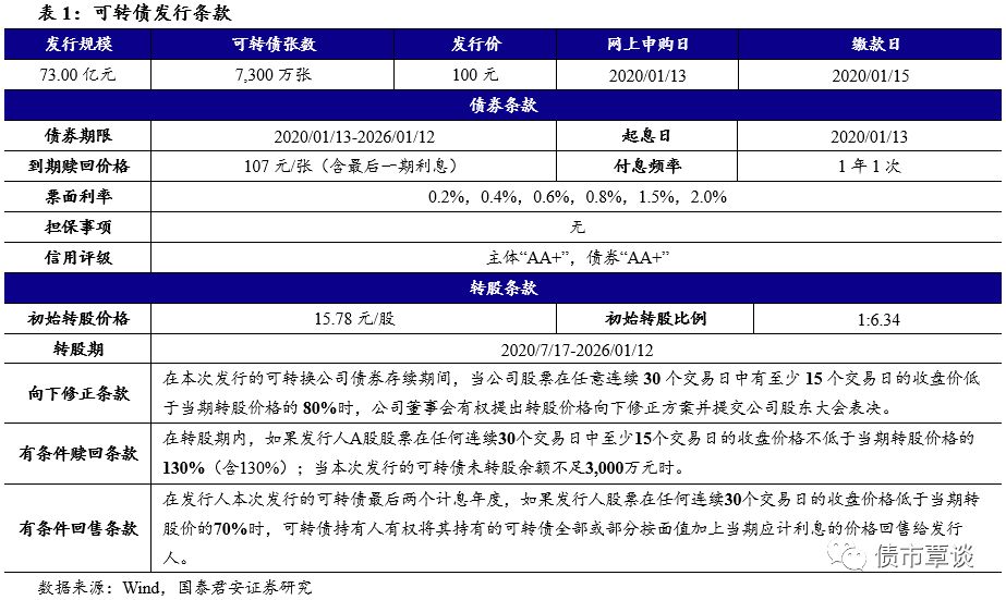 发行信息:本次转债发行规模为73.00亿元,网上申购及原股东配售日为2020年1月13日,网上申购代码为“370059”,缴款日为2020年1月15日。公司原有股东按每股配售1.0870元面值可转债的比例优先配售,配售代码为“380059”,实控人及一致行动人承诺配售金额不低于19.93亿元,对应比例为27.30%。网上发行申购上限为100万元,主承销商中金公司和东方财富证券最大包销比例为30%,最大包销额为21.90亿元。
