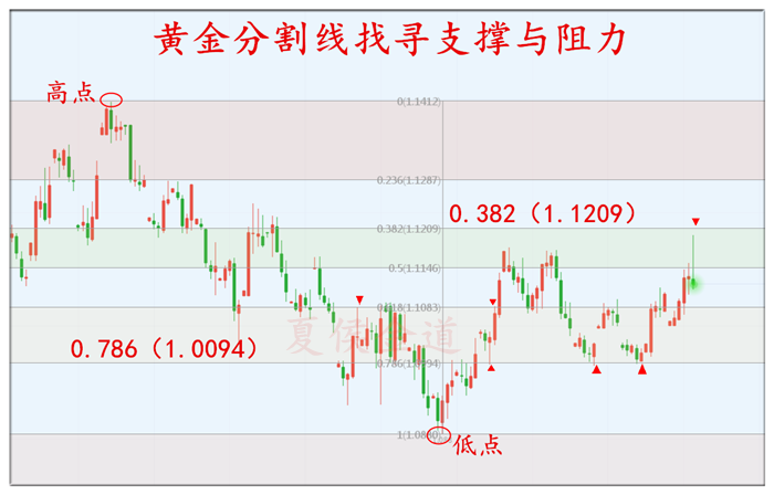 黄金分割线也叫斐波那契回调线,在一段明显有高低点的走势中,首先画出黄金分割线。线中23.6%、38.2%、50%、61.8%、78.6%等通常会起到阻挡作用。