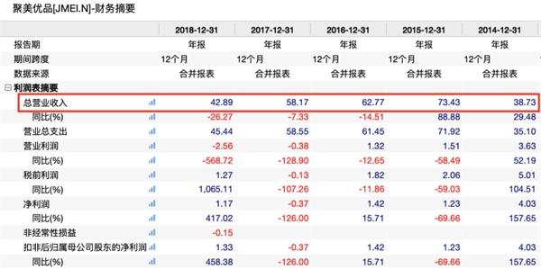 从2015年至2018年,聚美优品的营收从73.4亿元一路下滑至42.89亿元;股价也一路暴跌,最大跌幅一度超95%,目前其市值仅剩20亿美元。
