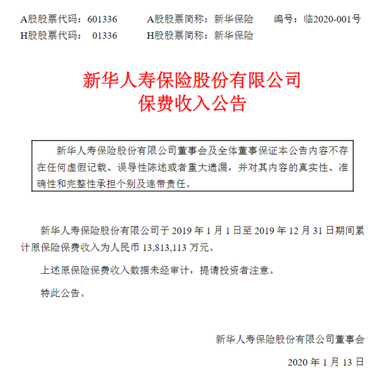 客服热线:18391752892新浪保险讯 1月13日消息,新华保险晚间公告称,2019年全年累计原保险保费收入为1381.3亿元。