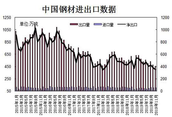 据海关总署公布的数据显示,2019年1-11月份我国出口钢材5966.6万吨,同比降低6.5%,出口金额496.9亿美元,同比降低10.7%。1-11月份进口钢材1081.3万吨,同比降低11.0%,进口金额126.9亿美元,同比降低16.6%。2019年我国钢材净出口量再度下滑,主要还是受贸易摩擦升温、海外经济增速放缓同时国内建筑及基建需求旺盛出口优势不明显等相关因素影响。