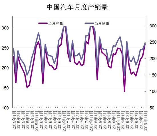 2019年,在整体经济下行压力与持续负增长的销量背景下落下帷幕。数据显示,1-11月,汽车产销分别完成2303.8万辆和2311万辆,产销量同比分别下降9%和9.1%,但产销量降幅比1-10月分别收窄1.4和0.6个百分点。特别是11月份,产销量恢复到250万辆左右的较高的水平,尤其是产量同比呈现了正增长,一方面反映企业在连续降低库存水平后,开始回补库存,生产节奏有所恢复;另一方面也反映了企业对今后的市场信心有所恢复。