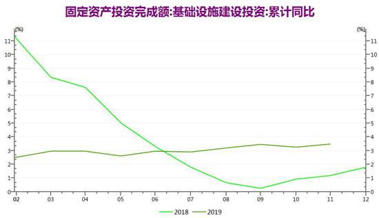 据数据显示,2019年1-11月,基建投资增速为3.5%,复苏力度不及市场预期。至于2020年为对冲经济下行,货币仍有宽松空间,可以提振基建国内贷款增速。而随着稳增长加码,中央出台多项举措刺激基建:首先,国常会明确提出,专项债不得用于土地储备和房地产等相关领域,并决定降低部分基础项目最低资本金比例,可通过金融工具筹措部分资本金。其次,11月27日,财政部提前下达2020年部分新增专项债务限额1万亿元,要求早发行、早使用,确保明年初即可见效。最后,12月政治局会议罕见的提到要加强基础设施建设,表明中央稳增长的决心。市场预计2020年基建投资下限有保证,上限有空间,在专项债额度提升和支出比例倾斜,叠加补充资本金政策刺激,基建投资可能将达到7.4%。