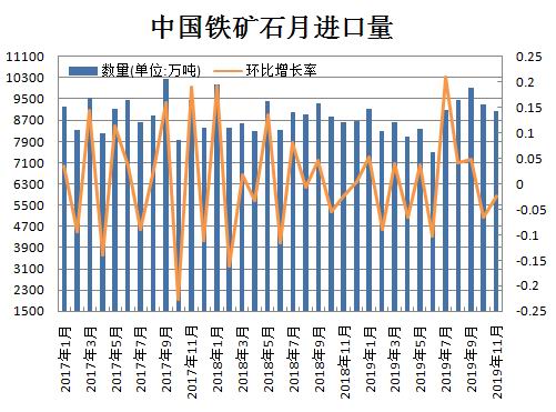 据海关统计,2019年1-11月国内铁矿砂及其精矿进口量达96920.6万吨,去年同期为97813.3万吨,同比下降0.9%。由于一季度巴西矿难、澳洲飓风等供应端事件导致主流矿山产量明显收缩,中国铁矿石在一二季度进口量同比下降明显,下半年随着矿山复产增多及国内钢厂需求旺盛,铁矿石进口量在7-11月份平均值达9374万吨,明显高于去年同期的8948万吨。据市场消息,2020年全球铁矿石增量主要来自主流矿山现有项目复产、提产及替代项目,预计2020年主流矿山增产约6000-7000万吨的铁矿石。