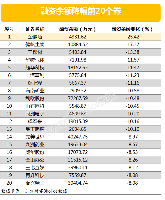 与之形成对比的是,当日有744股融资余额出现下降。其中,融资余额降幅超过3%的有156只。金徽酒的融资余额降幅最大,最新融资余额4331.62万元,与前一个交易日相比,融资余额下降了25.42%。