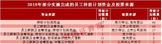 上市公司回购股份往往以较低价格转让给员工持股计划,以达到激励目的。2019年涉及股票来源涉及上市公司回购的57份员工持股计划中,有10余家公司采用0元或1元的股价转让,使得员工持股计划几乎没有亏损可能。
