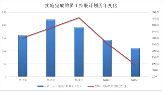 数据显示,员工持股计划实施趋缓的态势更为明显。2017年、2018年、2019年实施完成的A股上市公司员工持股计划数量分别为192份、143份、110份,募集资金总额分别为457.85亿元、260.23亿元、94.34亿元,近两年的降幅分别达43.16%、63.75%。