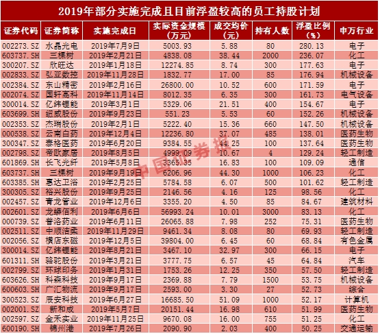 从目前员工持股计划浮动盈亏来看,2019年的110份员工持股计划中,有94份处于浮盈状态,占比85.45%。剔除0元或1元的超低价转让,有15份浮盈超过100%,另有15份浮盈超过50%,浮盈20%-50%的有22份,26份浮盈不足20%。