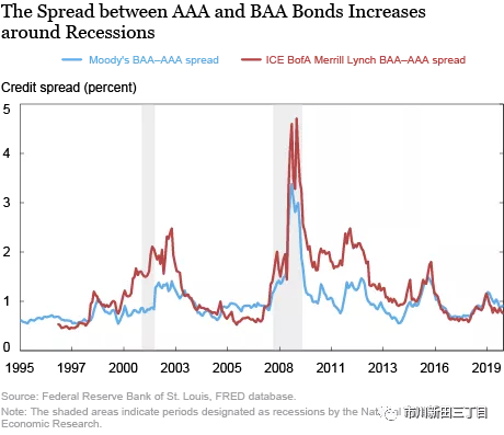 具有相似特征的企业所发行的期限相近的AAA级和BAA级公司债收益率之间的利差水平的高低体现的是投资者承担企业信用风险的意愿。如果其他条件不变,而BAA级与AAA级公司债的信用利差出现扩大就说明投资者承担信用风险的意愿不足。在经济衰退即将到来之前,投资者会增加投资组合中的高安全性资产的配置比率,因为投资者会因手中持有信用风险的敞口而坐卧不安。因此,BAA级与AAA级公司债之间的信用利差在经济衰退即将到来之际会变宽,如下图所示,该信用利差的水平就成了能有效地反映美国经济健康程度的指标。