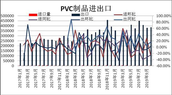 2019年10月份,国内PVC制品进口量为2755.65吨,环比减少877.29吨,降幅24.15%,同比下降939.02吨,降幅25.42%。1—10月份,我国共进口PVC制品36262.89吨,同比减少3163.22吨,降幅8.02%。10月份,我国共出口PVC制品385829.2吨,环比增加5964.55吨,增幅1.57%,同比则增加了52817.74吨,增幅高达15.86%。1—10月,我国累讲出口PVC制品357007吨,同比增加了524678.3吨,增幅达17.23%。从以上数据可以看出,2019年,我国PVC制品的出口仍保持平稳较快增长。其中增速最大的是PVC铺地产品,增幅高达18.75,但PVC型材,单丝,与墙饰的出口却明显减少。由于PVC铺地制品近几年颇受海外市场的青睐,而且在出口制品中占比也较大,预计2020年我国PVC制品的出口仍能保持平稳增长。