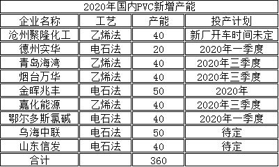 2019年,国内预计投放的新产能为207万吨,但实际投产的约为167万吨左右,剩下的产能都将延期至2020年投放。也就是说2020年国内PVC的新增产能有望达到360万吨,是2019年的4倍左右。不过,我们仍要关注,市场或许如2019年一样,会有不少新增产能期投产,如此一来,我们就需要密切关注新增产能的投产情况。
