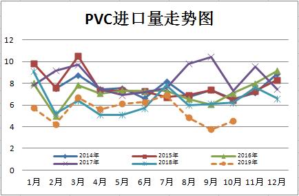 近两年来,我国PVC的进出口数量一直维持在一个较低的水平。进入2019年后,这个趋势也没有太大的改变。统计数据显示:2019年10月,我国共进口PVC4.5377万吨,环比增加了0.7652万吨,增幅20.28%,同比则减少了1.6623万吨,降幅26.81%。2019年1-10月,我国共进口PVC54.69万吨,较去年同期下降了8.04万吨,降幅12.82%。2019年10月出口PVC3.79万吨,环比下降了0.27万吨,降幅6.71%,较去年同期则上升了1.91万吨,升幅45.81%。1—10月份共出口PVC45.23万吨,较去年同期减少了8.52万吨,降幅15.85%。从以上数据可以看出,10月份,我国PVC进口量环比略有上升,出口量环比减少,显示国外PVC对国内市场的影响较大,且进出口量累计同比双双回落,显示国内PVC需求一般。