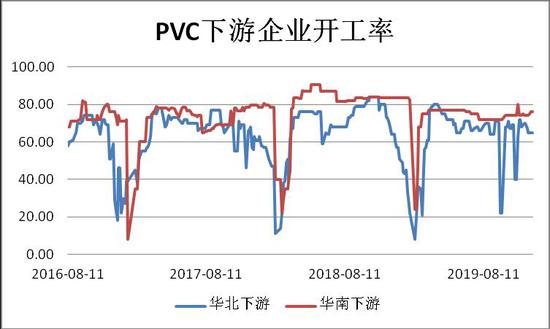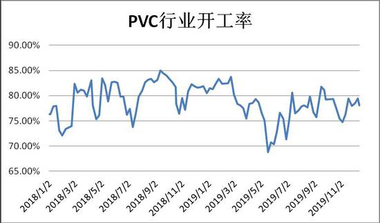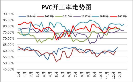 从分年走势图来看,2019年PVC下游企业的开工率还算差人意。仅管从9月—11月间,华北地区的PVC下游企业受环保等因素的影响,开工率大幅回落,但回升的速度也较快。总体来看,PVC的下游企业开工率仍维持在历年来的中位区域运行,显示国内对PVC制品的需求仍然较为平稳。预计进入2020年后,PVC的下游需求或将有所回升。