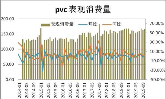 2010年10月份,国内PVC表观消费量为165.95万吨,环比上升了2.35万吨,升幅1.44%%,同比也上升了2.61万吨,升幅1.60%。2019年1—10月份,我国PVC的表观消费量共计1610.09万吨,较2018年上升了50.17万吨,升幅达3.22%。这表示我国PVC表观消费量的增速虽然有所放缓,但总体上仍处于平稳增长之中。