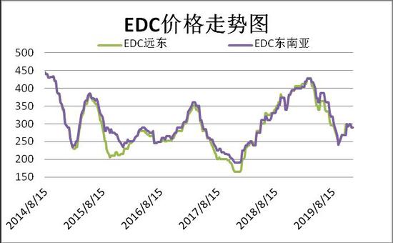 经过2018年的强势反弹,进入2019年后,EDC的价格呈现出震荡回落的格局。数据显示:截至2019年12月20日,CFR远东的EDC价格289美元,较上月回落了4美元,降幅1.37%,较去年同期相比则下降了116美元,降幅28.64%;CFR东南亚的价格走势与远东价格如出一辙,报289美元,较上月下降了4美元,降幅1.37%,较去年同期相比,则下降了111美元,降幅27.75%。