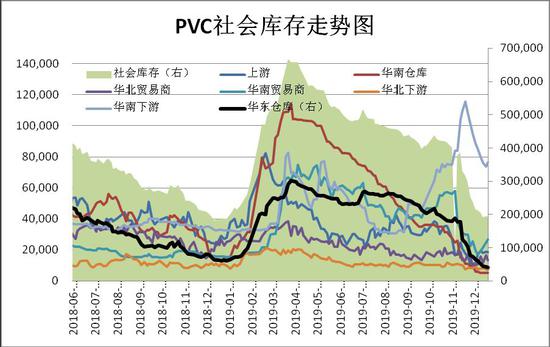 2019年12月份,PVC社会库存环比继续明显回落,但仍高于去年同期水平。数据显示:截至12月20日,PVC总库存报193590吨,较上月大幅减少了106437吨,降幅高达35.48%,同比则仍高出4480吨,升幅2.37%。分项细看,石化企业库存报18400吨,环比上升了2800吨,升幅17.953%,同比则下降了10560吨,降幅36.46%,华南仓库库存报5100吨,环比减少了6100吨,降幅54.46%,同比也下降了8050吨,降幅61.22%,华东仓库库存40800吨,环比减少了62200吨,降幅60.39%,同比也下降19700吨,降幅32.56%,华北贸易商报13500吨,环比减少了3800吨,降幅21.97%,同比也减少了13400吨,降幅49.81%,华南贸易商报26800吨,环比下降了3000吨,降幅10.07%,同比则增加了11100吨,增幅70.70%,华北下游企业报7100吨,环比下降了1300吨,降幅15.48%,同比也减少3900吨,降幅35.45%,华南下游企业报76400吨,环比下降了31800吨,降幅29.39%,同比则增加了43500吨,增幅132.22%。从以上数据可以看出,12月份,PVC的社会库存大幅回落,尤其是与去年同期相比,产业链各环节中,除华南地区的贸易商与下游企业外,其它各环节较大幅度的下滑,显示市场库存去化有所加速。此外,我们还看到,华南贸易商与下游企业的库存大幅增长,且数据值远远大于去年的同期水平,显示华南贸易商与下游企业有囤货的意愿,华南下游需求或将有所好转。