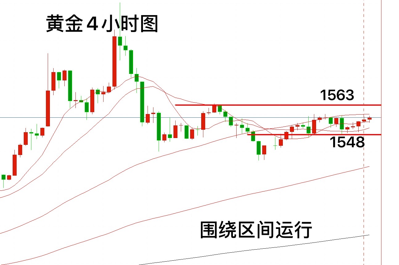 现在价格在1556一带震荡,没有太好的点位,目前在没有明确突破信号之前,行情都存在反复的可能,所以晚间围绕区间做布局,建议1562一带空,1552一带不破做多,防守各自5个点,目标看6个点空间,一但测压支持破位,那么短期则需要临盘调整。